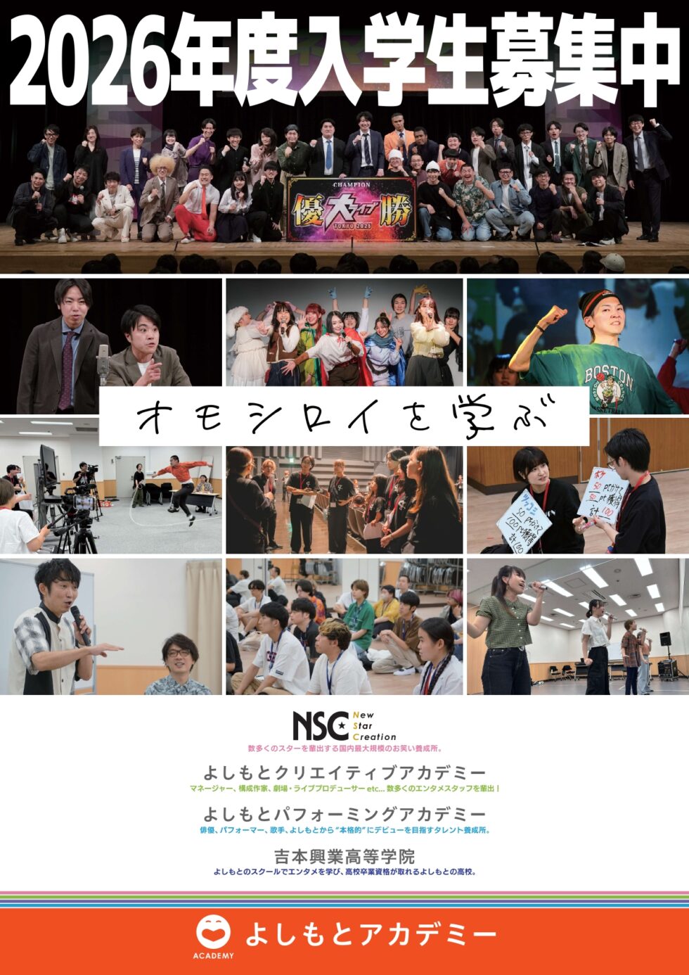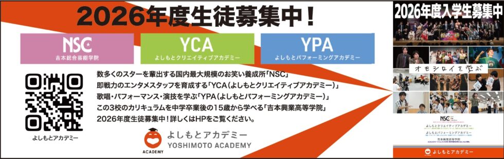 よしもとアカデミーというのは、将来エンターテイメント業界で活躍する人材を育成する機関で、芸人養成所のNSC(吉本総合芸能学院)やタレントマネージャーや脚本家、番組ディレクターなどのスタッフ人材を育成するYCA(吉本クリエイティブアカデミー)など、複数の学校で構成されています。